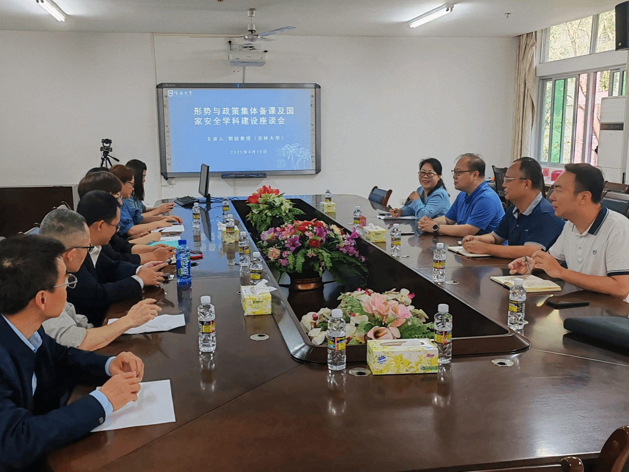 学科发展既要理论创新,又要扎根实践。郭锐教授同与会老师围绕国家安全学科建设方向、课程体系优化、国家安全教育实践路径等议题进行深入探讨。郭教授指出,一方面,应构建高效科学系统的课程体系,注重人才培养和高水平团队建设。另一方面,应深挖海南区位优势,聚焦海洋安全、自贸港安全等特色领域,打造具有区域竞争力的学科体系。此外,王善副院长基于国家总体安全战略和海南发展需求,强调要全局性谋划省级一流学科建设,实现资源优化配置和可持续发展。姜秀敏教授以“打铁还需自身硬”为要义进行总结,希望各位老师积极建言献策。