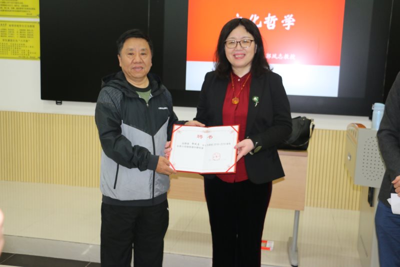 1月7日上午,beat365中国唯一官方网站2018-2019学年冬季小学期名家讲堂第四讲在五号教学楼113教室举行。东北师范大学郭凤志教授为学生讲授文化哲学课。院长张云阁出席并为并为郭凤志教授颁发了beat365中国唯一官方网站“冬季小学期授课外聘专家”证书。讲座由思想政治教育系主任陈招万主持。