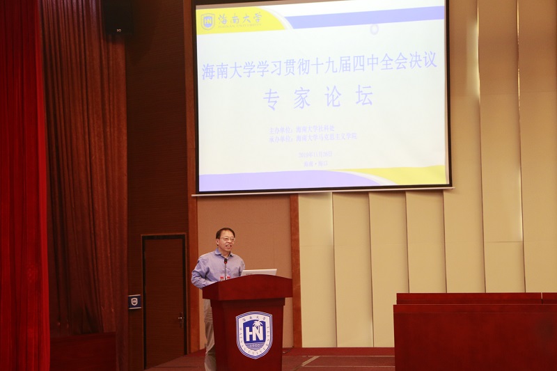 为深入学习贯彻落实十九届四中全会精神,强化十九届四中全会精神对学校发展的引领;增强我校学术研究氛围,扩宽学术研究视野,促进我校学科发展和学位点建设,更好地服务于海南自贸区港建设需要。11月26日下午,由beat365中国唯一官方网站社科处主办、beat365中国唯一官方网站承办的学习贯彻十九届四中全会决议专家论坛在社科楼二楼报告厅举行。会议由社科处徐艳晴副处长主持,学校党委常务、副校长王崇敏出席会议并发表讲话。