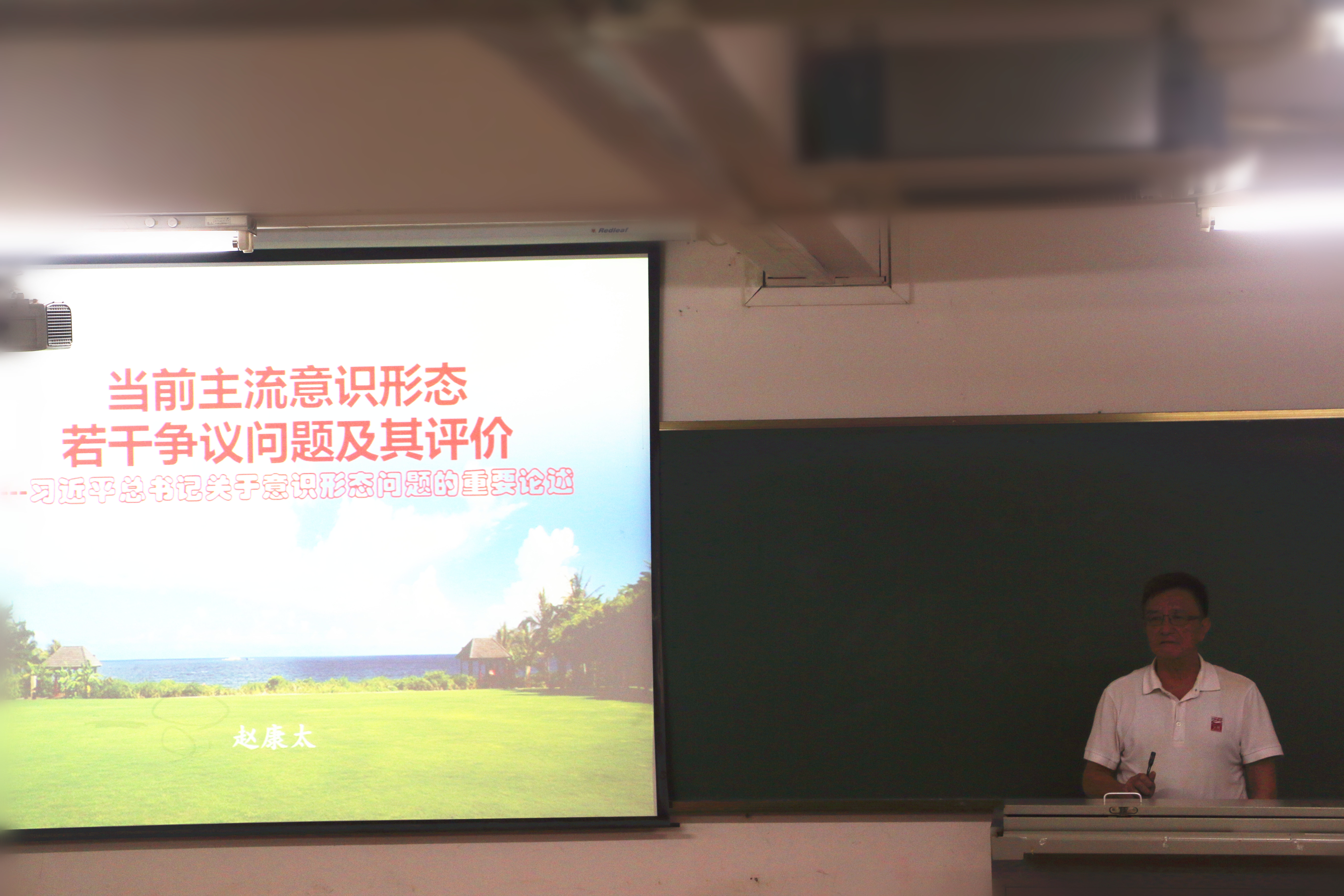 12月7日晚,海南省社科联原主席、社科院原院长赵康太教授以“当前主流意识形态若干争议问题及其评价——习近平总书记关于意识形态问题的重要论述”为题,结合古今中外事例,围绕“左右之争”,深入分析当前的主流意识之争及其社会影响,以及当前主流意识形态若干重大争议问题和原因,并对其进行基本评价。他表示,任何一种声音都有助于我们保持清醒头脑,但同时我们必须坚持中国共产党的领导,不能走老路,不能走邪路,要坚定不移走中国特色社会主义道路,在发展中解决问题,在全面深化改革中解决问题。