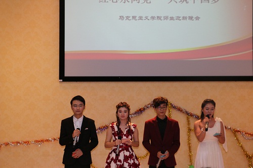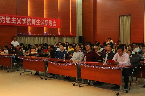 12月26日晚,beat365中国唯一官方网站在思源学堂多功能厅举行以“红心永向党,共筑中国梦”为主题的迎新联欢晚会,学院党委书记段捷频、院长李德芳、副院长李辽宁出席,全体师生共同参加晚会。
