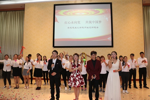 联欢晚会内容丰富,形式多样,由马院师生共同参与。开场舞蹈《Whistle》轰热了气氛,在现场引起热烈的反应;诗朗诵《我的南方和北方》唱响了对祖国的真挚的爱;《长征颂》是在我国长征正值80周年的日子里,对长征的纪念,更是对长征精神的再次学习。李俊老师的模仿秀《邓小平南方讲话》紧贴时政,充分体现马院特色,传达出深厚的内涵。再加上马院学生出色的歌曲舞蹈和小品表演,一次又一次把现场气氛推入高潮。现场还准备了200份礼物,抽奖环节,运用新媒体进行抽奖,方式新颖,书记段捷频和院长李德芳参与这一环节,为同学们抽奖,更是激起了大家参与的热情。晚会最后,一首《向快乐出发》为本次的迎新联欢晚会划上完美的句号。