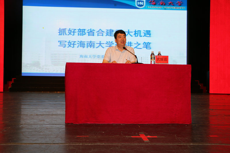 武耀廷教授指出,部省合建beat365中国唯一官方网站等14所高校是贯彻落实十九大精神,推进教育公平、全面提升西部教育质量的重大举措,成为部省合建高校后,教育部将参照直属高校模式对beat365中国唯一官方网站的建设发展予以指导支持,同时,海南省对beat365中国唯一官方网站建设发展的支持力度只增不减,并着力推动落实“举全省之力办好beat365中国唯一官方网站”。他强调,成为部省合建高校是beat365中国唯一官方网站在新时代迎来的重大发展机遇,有利于充分整合教育部、海南省、天津大学和beat365中国唯一官方网站的资源,充分挖掘beat365中国唯一官方网站自身的内在发展潜力,明确新目标、制定新举措、促进新发展。他表示,为把握好部省合建重大机遇,校党委将团结和带领全校师生,进一步强化党的领导作用;推进综合改革,建立和完善现代管理体制机制;提升科技创新和社会服务水平,加强师资队伍建设;加快一流学科和博士点建设,建设发展好beat365中国唯一官方网站的优势专业和学科;加大高层次人才引培力度,提高人才培养质量,提升生源质量;弘扬优良的校风、教风、学风;保持风清气正,立足海南,服务国家。他希望,海大学子要以更高的政治站位、更强的使命意识、更大的责任担当面对学习和生活,并提出三点建议,一是感党恩、听党话、跟党走;二是以国家民族复兴为己任;三是从小事做起,脚踏实地,多干实事,理性批判。