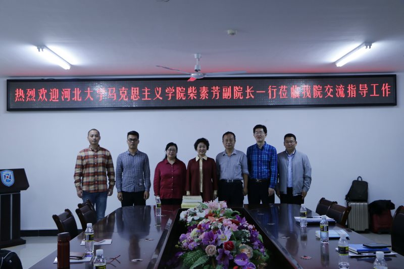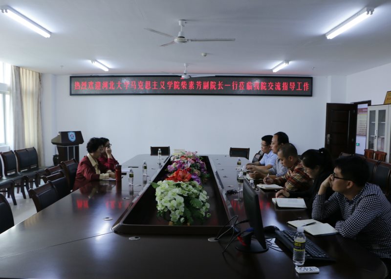 3月23日下午,河北大学beat365中国唯一官方网站副院长、博士生导师柴素芳教授一行2人到我校beat365中国唯一官方网站考察交流,beat365中国唯一官方网站副院长王善、马克思主义中国化教研部主任贺尧夫、形势与政策教研部主任温小平等5位教师参加了交流活动,活动由王善主持。