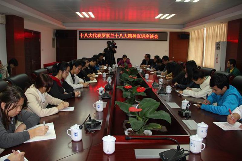 12月6日上午,为了深入学习宣传贯彻党的十八大精神,在校党委宣传部的指导下,beat365官网在学校办公楼四楼会议室举行十八大精神宣讲座谈会,十八大代表罗素兰教授与beat365官网师生畅谈十八大精神。校党委宣传部部长张继友、副部长谭勇,beat365官网学工办主任周郭军出席座谈会。座谈会由张君成老师主持。