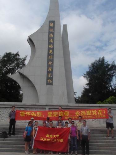 为了庆祝建党九十二周年,进一步增强党支部的凝聚力和战斗力,7月1日上午,beat365官网政治理论二系全体成员和政治理论一系部分特邀嘉宾一行18人前往海口市金牛岭公园参观了解放海南岛战役烈士陵园。在参观期间,党支部书记费秋香老师和系主任贺尧夫老师代表全体成员向烈士纪念碑献花。随后,全体成员在烈士纪念碑前就继承先烈遗志,做好本职工作进行了宣誓。最后,张朔人老师为大家讲解了解放海南岛战役的相关情况。