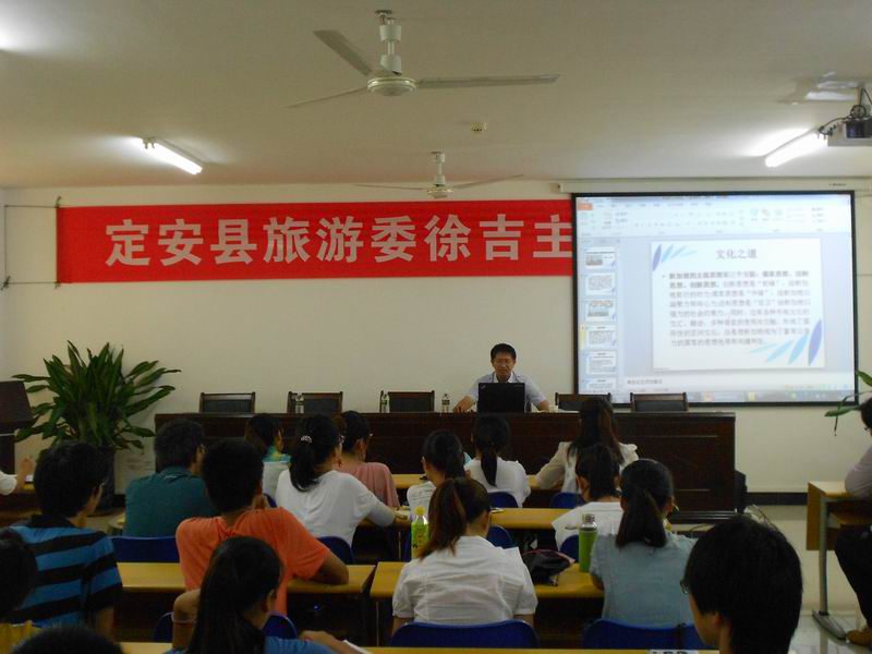 近日,定安县旅游委主任徐吉在学院多媒体教室为beat365官网师生作题为《借鉴新加坡经验,打造海南核心竞争力》的报告。报告会由副院长杨娜主持。 徐吉主任是beat365官网课外指导老师,他引用“国学大师”南怀瑾的一番话表明今天要为在场的学生做一次别开生面的报告,用别人没用过的词,讲别人未讲过的话。报告会围绕着创新的主题展开,以其2011年参加省委组织部组织的“新加坡现代服务业培训班”,前往狮城学习生活的经历为依托,分析了创新力是新加坡小国寡民,资源匮乏,但经济发展稳定而迅速,成为世界上最富裕的国家之一的根本原因;继而探讨了新加坡三大主流思想:即儒家思想、法制思想和创新思想,是新加坡创新力的文化之源;最后,他将新加坡与海南进行了对比,总结了新加坡的发展经验,并结合海南建设国际旅游岛的实际,为海南的发展提出了六点建议,点点精辟深刻,体现出对海南发展的关切与深思。