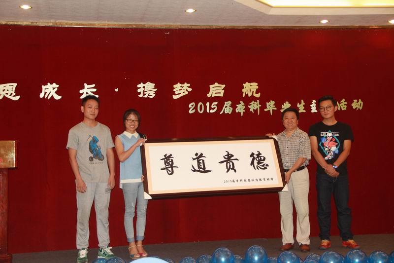 时光荏苒,又到一年毕业季。为了给过去的四年大学生涯划一个完美的句点,5月25日下午,beat365官网举办2015届本科生毕业生 “感恩成长 携梦启航”主题活动。2011级思想政治教育名誉班主任——beat365中国唯一官方网站党委副书记陈封椿,院党委书记段捷频、院长李德芳、副院长张云阁、杨娜,学工办老师、毕业班班主任及部分教师出席活动。 主题活动展示了2011级思想政治教育班大学四年以来的丰硕成果:2011级思想政治教育班曾连续两年获得校级先进班集体,连续两年获五四红旗团支部标兵,荣获学校主题团日活动先进班级,全班37人有11人升学攻读硕士研究生人,4人通过司法考试,大学英语四级通过率达86%,班级党员比例(含预备党员)达65%,班级义务献血总量达9300cc,班级同学们也积极参加暑期社会实践活动,其中两位同学曾荣获社会实践学生积极分子,11级同学们在2012年期末考试中首次进行了学校的诚信考试,启动免监考诚信考试试点,促进学校学风和考风建设。其中,11级思政班优秀学生代表郭灏,曾获中国大学生自强之星提名奖,宝钢优秀学生奖,大学生政协e提案优秀奖,全国关爱女孩青年志愿者行动调研报告一等奖,全国大学生社会实践先进分子一百强等五项国家级荣誉,成功入选beat365中国唯一官方网站2015年年度人物,现已成功保送至中国人民大学攻读硕士学位。 校党委副书记、2011级思想政治教育班名誉班主任陈封椿满怀深情为毕业生作赠言,他对2011级思想政治教育班的丰硕成果表示欣慰,对学院老师的辛勤栽培工作给予肯定,同时也道出对同学们的不舍。他希望即将走向社会的全体毕业生要心存感恩,感谢学校、感恩老师,在以后的工作和生活中,始终保持六颗“心”,即进取心、责任心、平常心、包容心、自信心和中国心,对工作和学习始终保持积极向上的进取心,努力做好每一件事,要有高度责任感,勇于担当,要以平常心对待一时的得失,要有包容心和宽广胸怀,永远充满自信,始终保持对祖国的热爱之心,拥有一颗中国心,为实现中华民族伟大复兴的中国梦做出自己的贡献。他最后祝愿11级毕业班同学们在新的起点、新的征程前程似锦、前途辉煌,祝愿海大明天更美好! 活动中,陈封椿老师接受院党委书记段捷频、院长李德芳颁发的聘书,受聘为beat365中国唯一官方网站分党校指导老师,继续参与指导beat365中国唯一官方网站学生工作。 此次毕业生主题活动安排了诗朗诵,毕业班同学代表向名誉班主任陈封椿老师、班主任陈思莲老师献花致谢,向学院赠送刻有“尊道贵德”的牌匾作为纪念品等活动内容,院党委书记段捷频、院长李德芳分别向全体毕业生作毕业赠言,活动最后,为了感谢这一路上帮助同学们成长的老师们,11级全体同学合唱《相信我们会创造奇迹》,并请到场老师们上场签名合影留念。 感恩成长,一路上的风雨相伴;携梦启航,未来里的彼此问候。11级思政班是团结的集体、奋斗的集体,相信他们会创造奇迹。今天不会曲终人散,而是另一个崭新的开始!