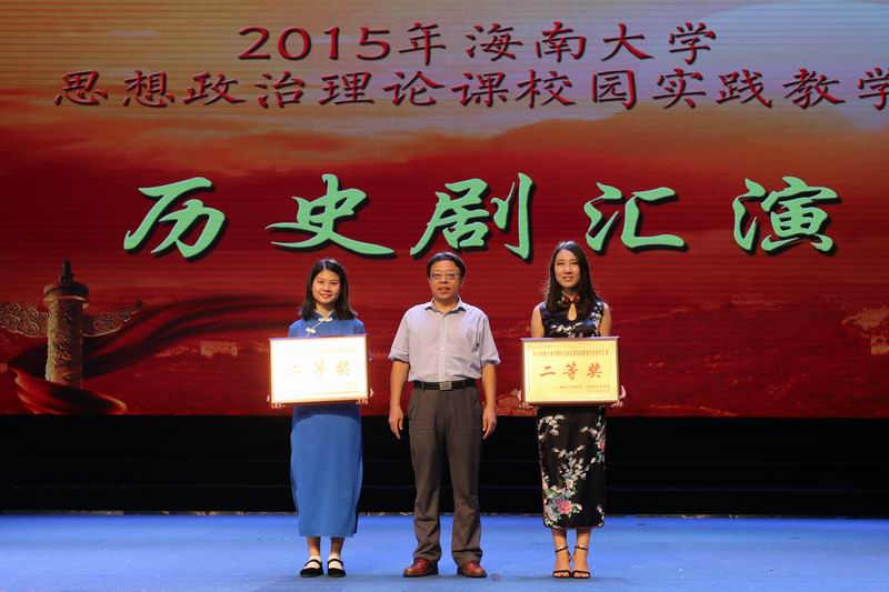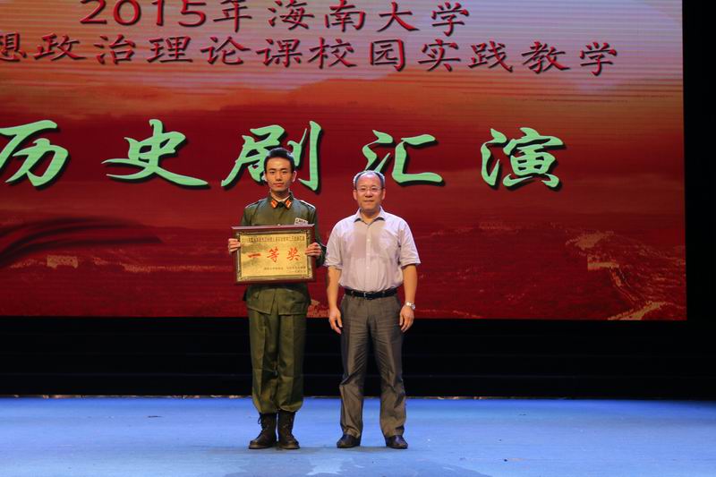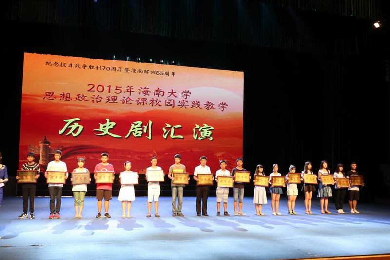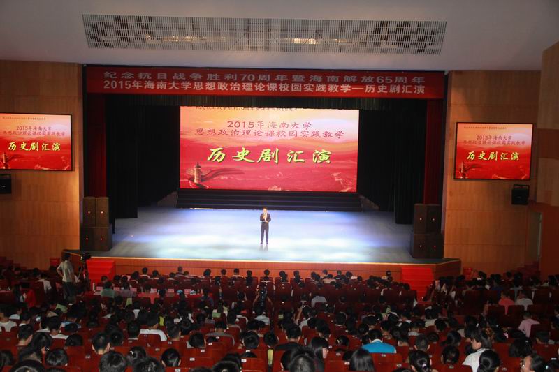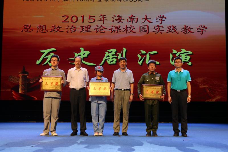 6月2日下午,由我校beat365中国唯一官方网站主办,以纪念抗日战争胜利70周年暨海南解放65周年为主题的思想政治理论课校园实践活动——历史剧汇演在思源学堂举行。海南省委宣传部副部长郭志民,海南省委宣传部理论处处长温龙、海南省教育厅思政处处长文强,我校副校长王崇敏出席活动,来自全省18所高校思想政治理论课教学部门负责人及骨干教师60余人参与了现场观摩。 历史剧表演活动在《中国近现代史纲要》课堂上已经开展了3个月,此次参加汇演的6个剧目是从2014级不同专业的8000多名大学生自编、自导、自演的354个剧目中精选而出的。剧目主题鲜明,选材合理,内容积极向上,意义深刻。同学们表演形象逼真,动作到位,神态自然大方。演出过程中剧情衔接良好,整体效果佳,观众不时爆发阵阵掌声。 汇演结束后, 海南省委宣传部副部长郭志民和beat365中国唯一官方网站副校长王崇敏分别为获一、二等的同学颁奖,海南省委宣传部理论处长温龙、海南省教育厅思政处处长文强和我校教务处处长欧阳克毅共同为获三等奖的同学颁奖,欧阳克毅对汇演进行了精彩的专家点评。 此次活动吸引了多家媒体的高度关注,新华网、中新网、海南日报均对此事进行了报道。兄弟院校观摩教师对此项活动寄予了高度的评价。学校党委领导对活动的开展给予关心和指导,校党委办公室、宣传部、教务处、艺术学院、团委、艺术团、网教中心等部门给予了大力的支持与配合。 学校教务处处长欧阳克毅、校党委宣传部副部长谭勇、beat365中国唯一官方网站领导班子全体成员和部分学院分管教学副院长参加了活动。 据悉,beat365中国唯一官方网站思想政治理论课教学团队经过多年理论研究与实践探索,成功构建了“一主三辅”实践教学模式,2014年,该项目入选教育部思想政治理论课教学方法改革择优推广计划。目前,该项目是海南省委宣传部和beat365中国唯一官方网站共建beat365中国唯一官方网站的重要内容,是海南省教育厅重点推广项目。此次的历史剧汇演是“一主三辅”实践教学模式中“校园实践”教学的重要内容。