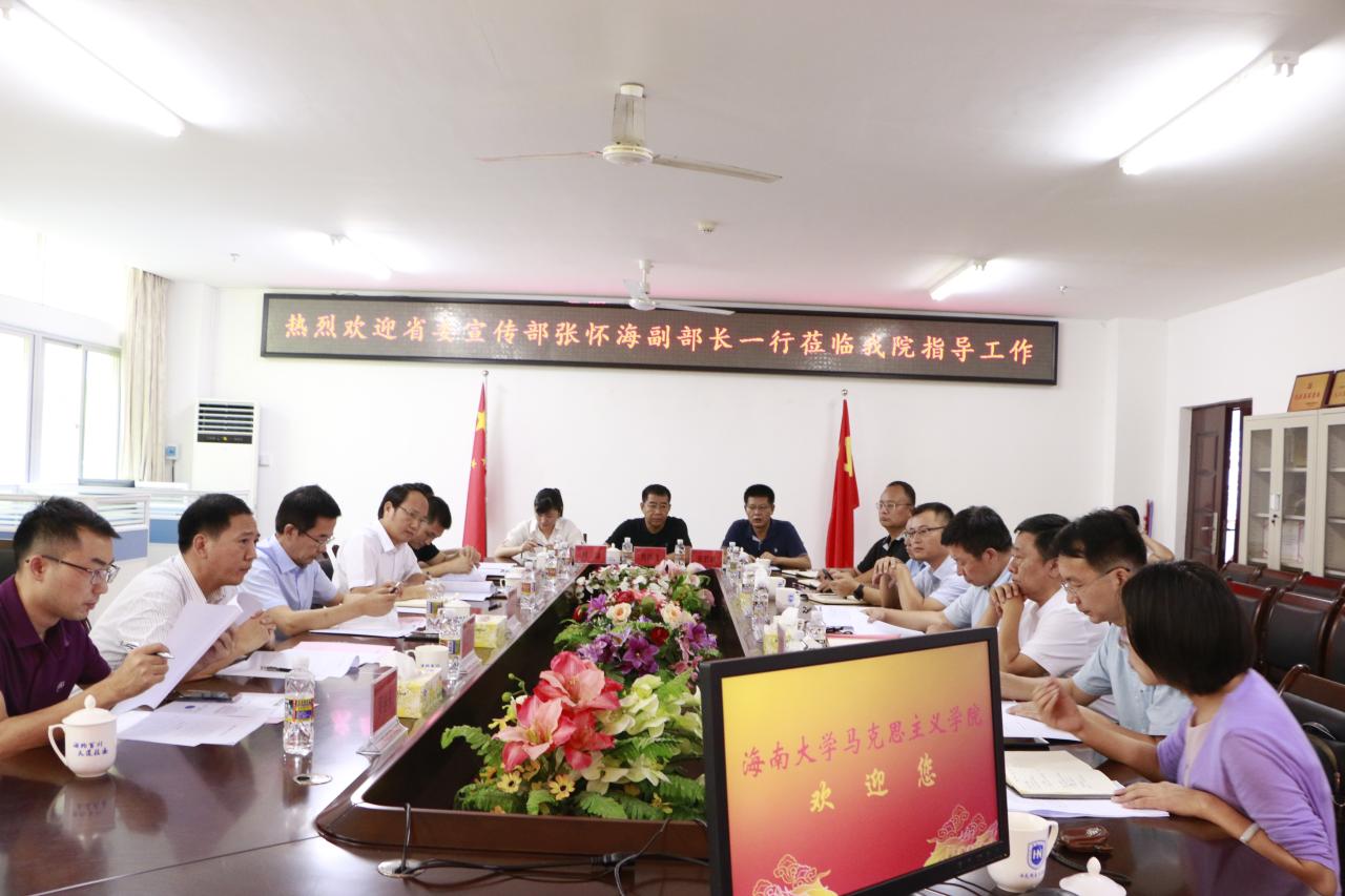张怀海在认真听取汇报并与参会人员进行充分交流后发表讲话,对beat365中国唯一官方网站近些年的建设发展和所取得成效给予充分肯定。他指出,海南自贸港建设让海南成为全国乃至全球舆论关注的重点焦点,做好意识形态工作、舆情工作至关重要。beat365中国唯一官方网站作为海南龙头高校,要按照沈晓明书记要求,当好参与者、参谋部、孵化器和后备队,服务海南全面深化改革开放和自由贸易港建设,beat365中国唯一官方网站在海南意识形态工作中具有特殊使命和责任。他认为,海大马院正处于快速发展时期,在全国高校马院中显示度和影响力明显提升,学院制定的“十四五”规划具有较强的可操作性,希望海大马院在海南自贸港建设背景下,提高政治站位,对标全国、放眼全球,高标准、高要求推进相关建设发展工作。他表示,省委宣传部将按照中央和省委相关文件精神,进一步关心和支持海大马院建设发展,推进落实部校共建beat365中国唯一官方网站相关工作,扎实推动马院内涵式发展,切实提高人才培养质量。