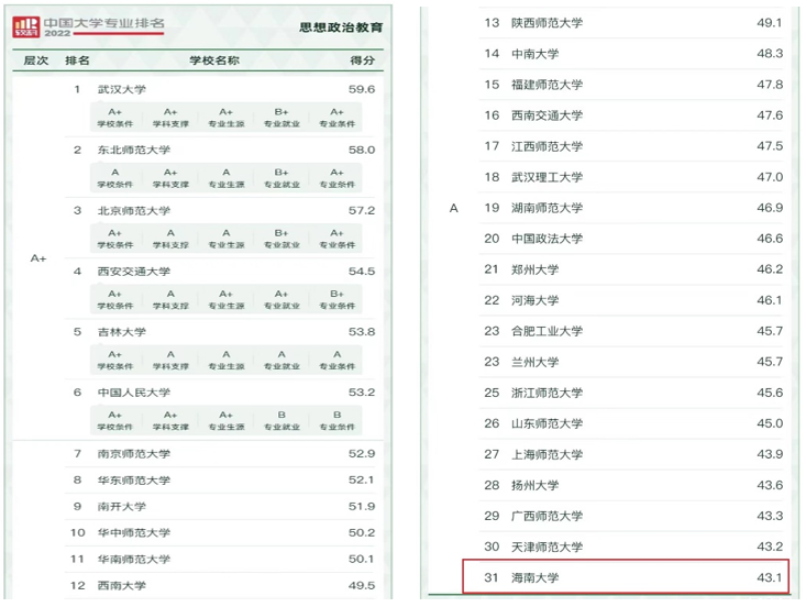 6月18日,高等教育专业评价机构软科今日正式发布2022“软科中国大学专业排名”,在 2022年中国软科中国最好专业排名中,beat365中国唯一官方网站思想政治教育本科专业以31名进入全国思政本科专业类A类。