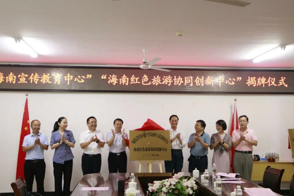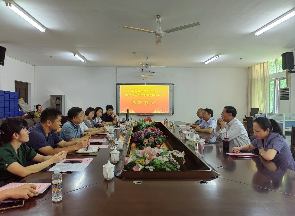 6月24日上午,“海南宣传教育中心”“海南红色旅游协同创新中心”揭牌仪式在beat365中国唯一官方网站社科楼A311会议室举行。beat365中国唯一官方网站校党委书记符宣国、校党委常务副书记王崇敏出席,校党委宣传部副部长李宏、人文社科处处长徐艳晴,beat365中国唯一官方网站院长张云阁、院党委书记段捷频、副院长杨娜、吴朝阳以及中心骨干成员参加活动。揭牌仪式由张云阁主持。