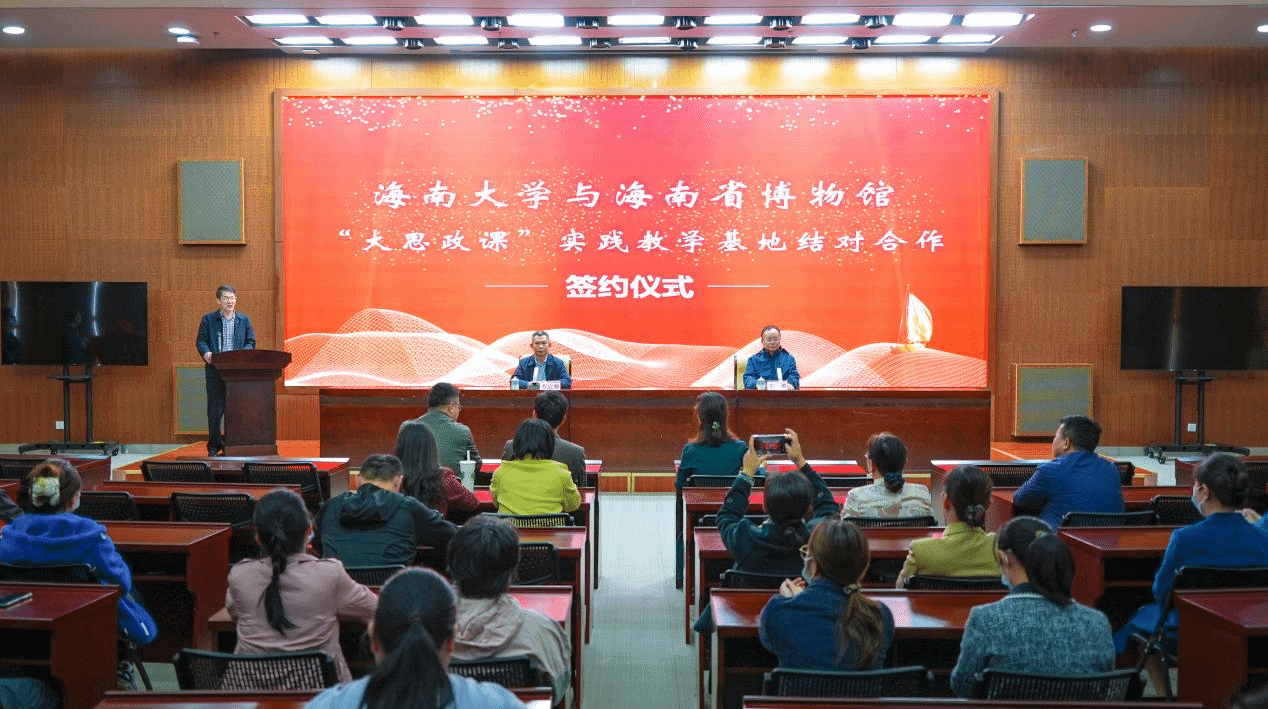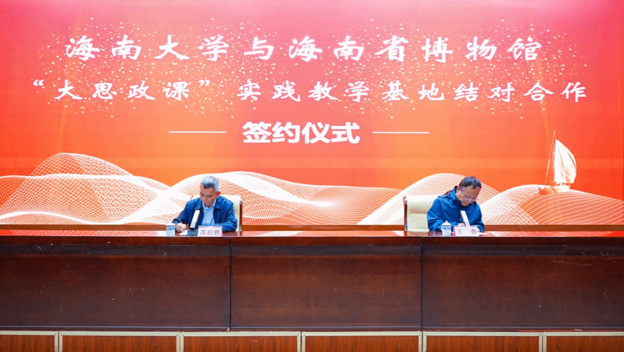 仪式中,海南省博物馆馆长苏启雅与beat365中国唯一官方网站副院长王善共同签署《“大思政课”实践教学基地结对合作协议》,并为“大思政课”实践教学基地揭牌。