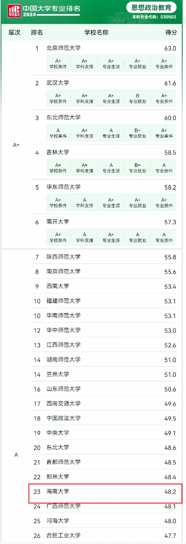 据悉,此次排名包括810个本科专业,涉及93个专业类、12个专业门类。每个专业榜单发布的是所有开设该专业的高校中排名位列前50%的高校,思想政治教育本科专业共有165所高校上榜。“软科中国大学专业排名”是迄今为止覆盖专业数量最多、参评专业规模最大的中国大学本科专业排名,旨在为学生和家长选择本科专业提供客观参考,也为高校的本科专业建设与分析提供事实依据。