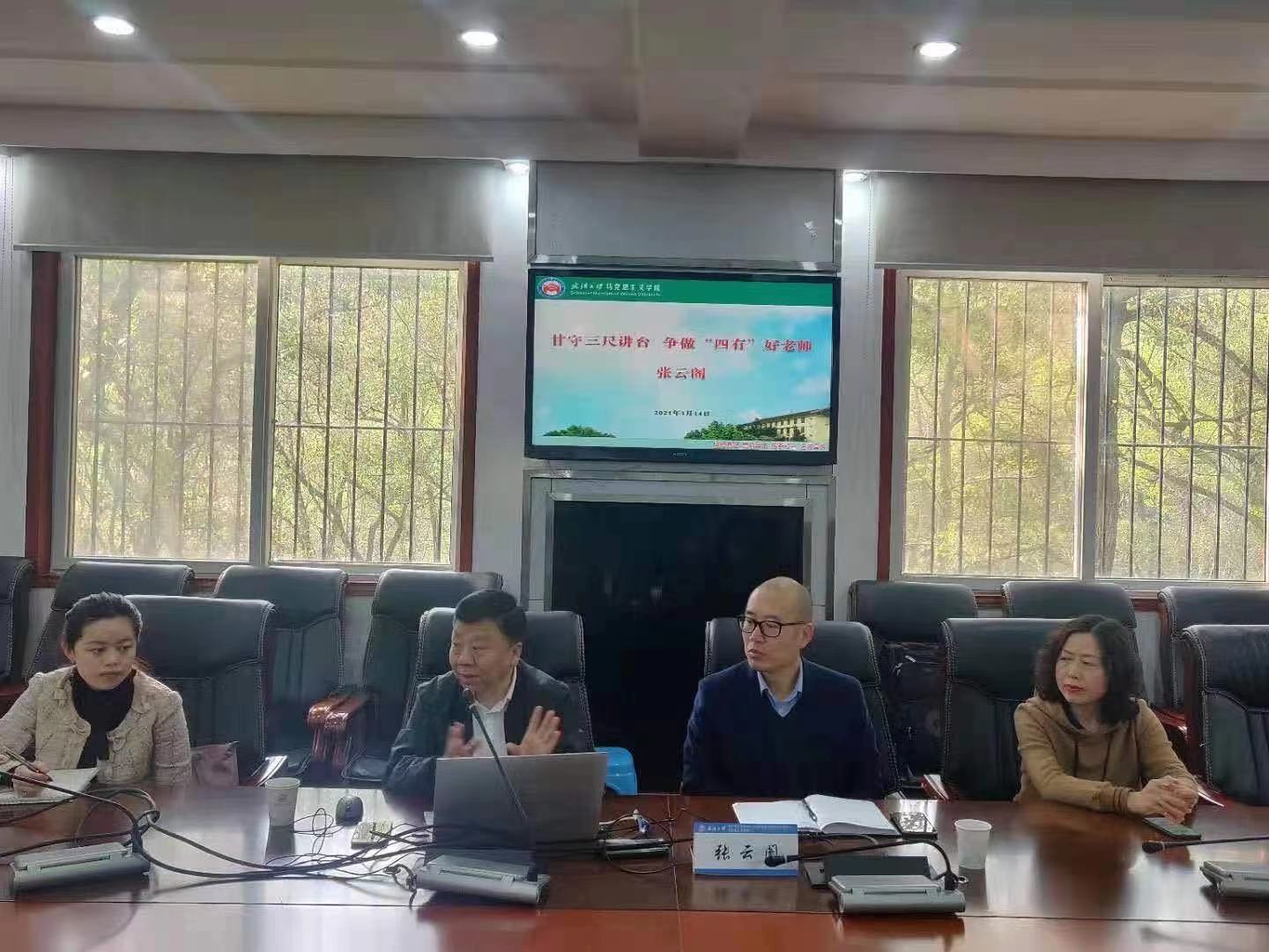 14日上午,应武汉大学beat365中国唯一官方网站的邀请,张云阁教授又为学院师生做了一场:甘守三尺讲台 争做“四有好老师”的师德师风报告。张云阁教授从教书育人是教育的本质要求、好老师是大学的灵魂、好老师必备的条件和实现“四有”好老师的路径四个方面,结合自身的工作经历,报告了自己的理解与体会。张教授的报告内容丰富、案例生动、语言幽默,教育性强,得到了与会师生的高度评价。报告结束后,张教授还回答了师生们提出的问题。