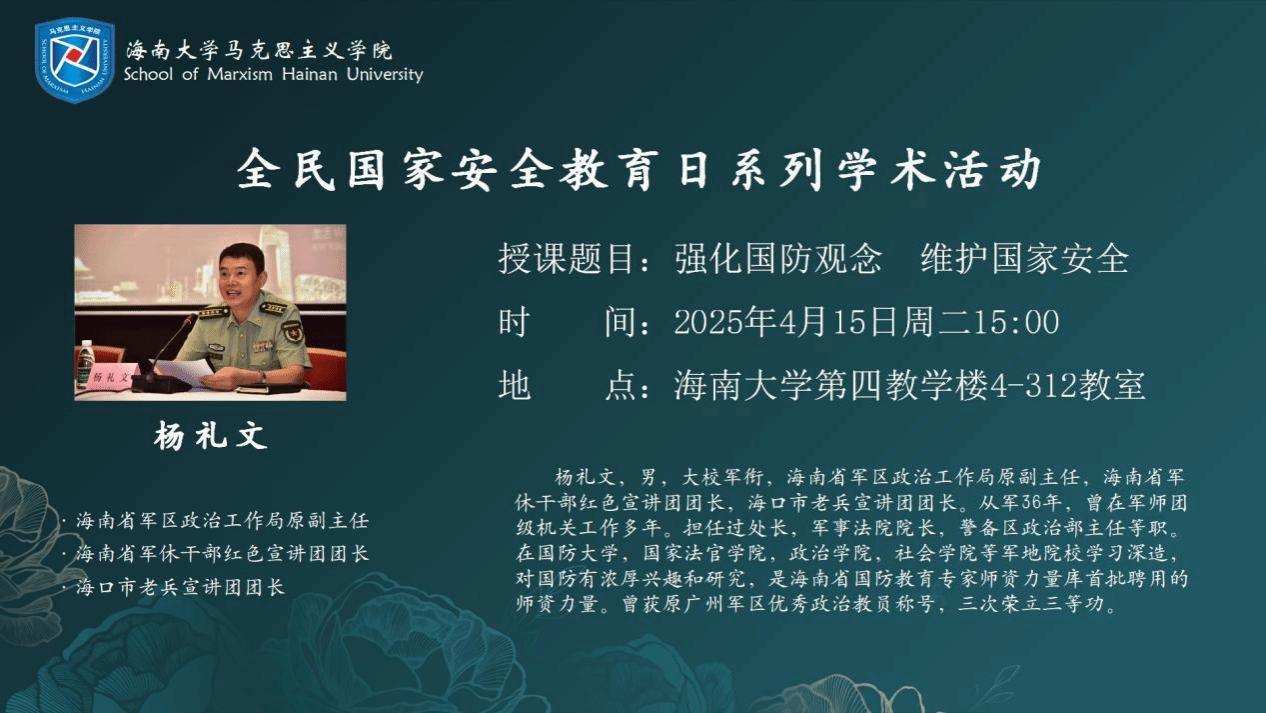 2025年是《中华人民共和国国家安全法》颁布施行10周年,为深入学习贯彻总体国家安全观,提升国家安全意识和素养。2025年4月15日下午,beat365中国唯一官方网站邀请海南省军休干部红色宣传讲团团长杨礼文走进形势与政策课堂,以“强化国防观念,维护国防安全”为主题,从树立国防观念的历史背景和当前国际局势两个方面展开授课。